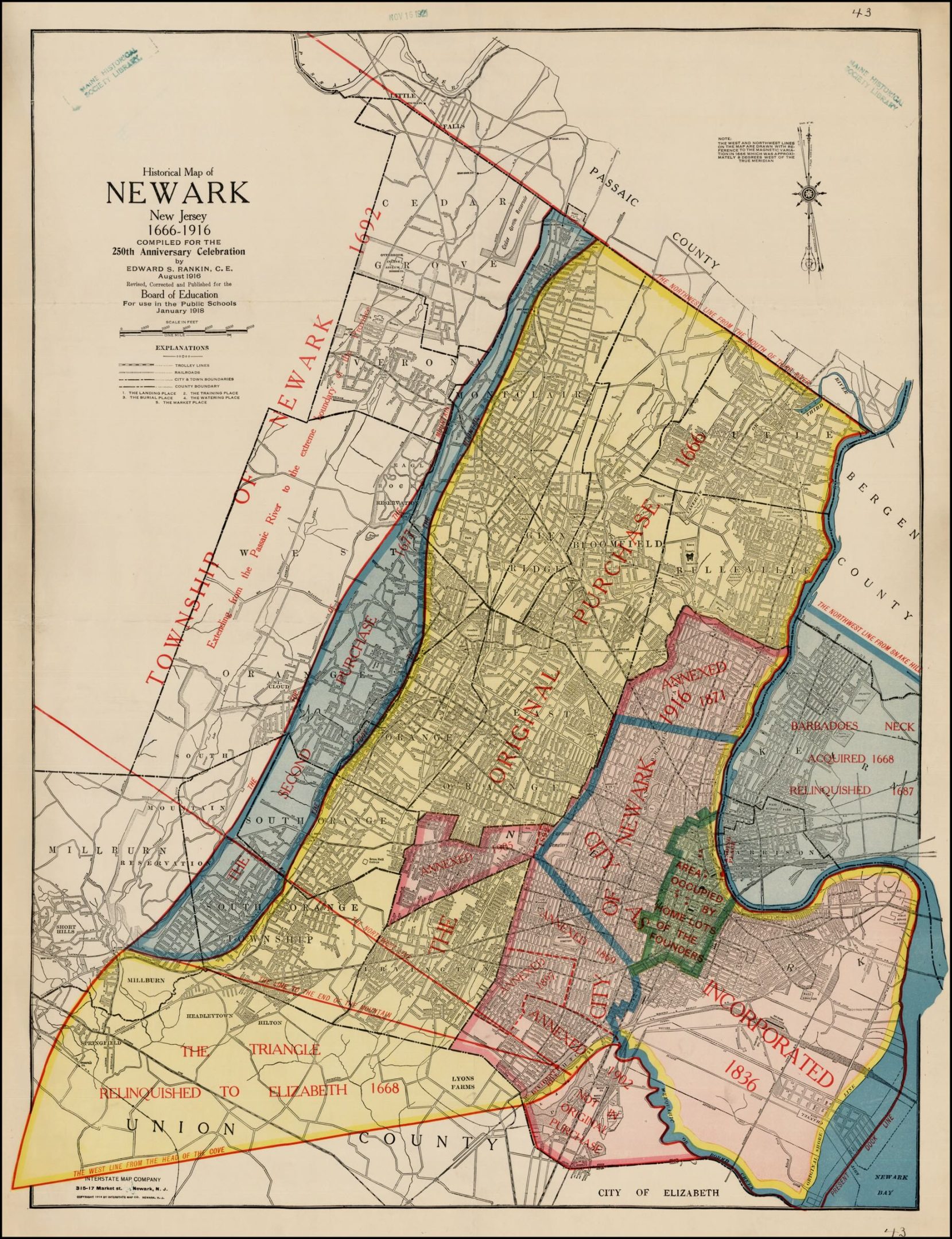 Historical Map of Newark New Jersey 1666-1916 Compiled for the 250th Celebration by Edward S. Rankin, C.E. August 1916 Revised, Corrected and Published for the Board of Eduction in the Public Schools January 1918